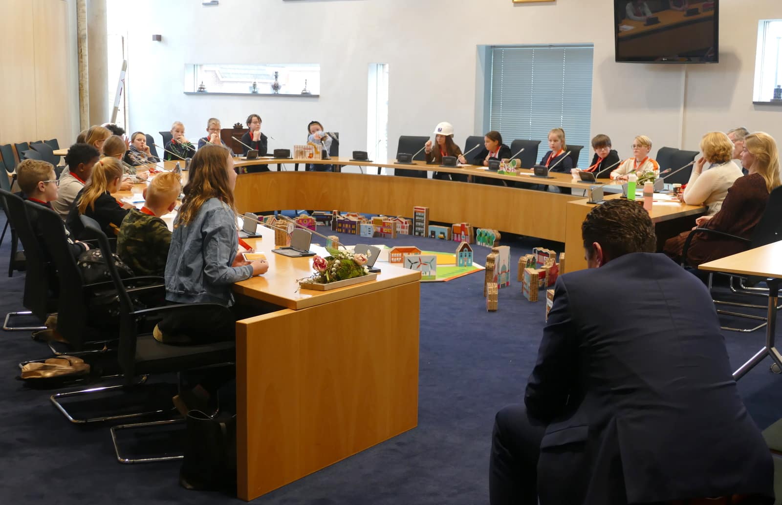 De klassen namen plaats op de raadszetels achter de microfoons. Samen bouwden ze letterlijk het dorp Democracity. Heel groep 8 wilde graag een basisschool, maar over de locatie was discussie. Beide groepen vonden duurzaamheid belangrijk in het dorp. Tom Bakker (SGP Dantumadiel) en Ferry van der Ploeg (FNP Dantumadiel) beantwoordden de prangende vragen over hoe het is om raadslid te zijn.